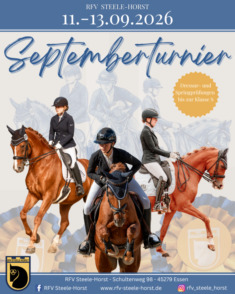 Der Startschuss für unser Septemberturnier ist gefallen! Vom 11. bis 13. September erwartet euch ein abwechslungsreiches Prüfungsangebot im Springparcours als auch im Dressurviereck.